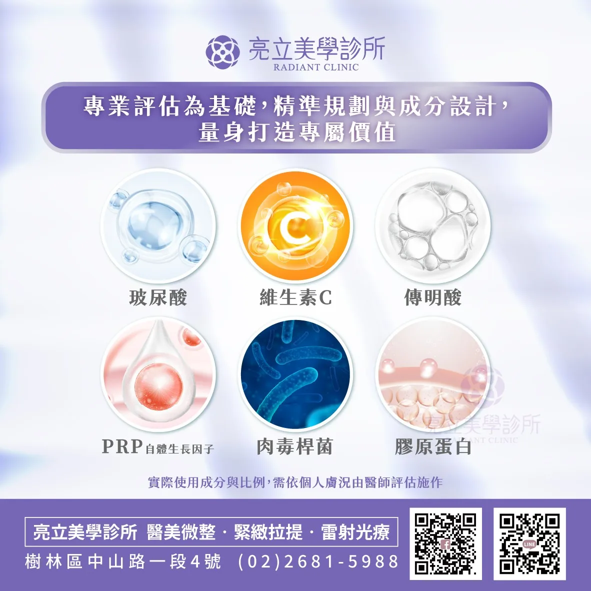 💧水光針成分|精準補給,喚醒肌膚光采 依肌膚需求客製搭配, 從保濕、修護到亮白,全面提升膚質狀態! ▪ 玻尿酸|深層補水,提升肌膚彈潤度 ▪ 維生素C|提亮膚色,改善暗沉 ▪ 傳明酸|均勻膚色,提升透亮感 ▪ PRP|啟動修護,強化肌膚自我更新力 ▪ 肉毒桿菌|細緻毛孔,改善細紋紋理 ▪ 膠原蛋白|支撐結構,增加緊緻彈性 從內而外補充所需養分, 打造水潤、透亮、細緻的理想膚況⭐ *本宣傳以較生活化的說法呈現,讓民眾更容易理解,內容僅供參考。療程名稱、效果、使用方式及注意事項,仍需由醫師親自說明與評估。部分資訊可能與仿單不同,包含仿單未核准的應用。所有療程皆有風險,適用情況也會因人而異,請由醫師評估後再行決定。